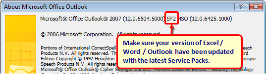 Asegúrese de que su versión de Excel / Word/ Outlook haya sido actualizada con los últimos paquetes de servicio de Windows.