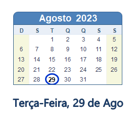 29 de Agosto de 2023: Feriados e dias festivos no BrasilNão existem Feriados ou dias Comemorativos no Brasil nessa data. 29 de Agosto de 2023: Feriados Internacionais e Dias Internacionais festivos